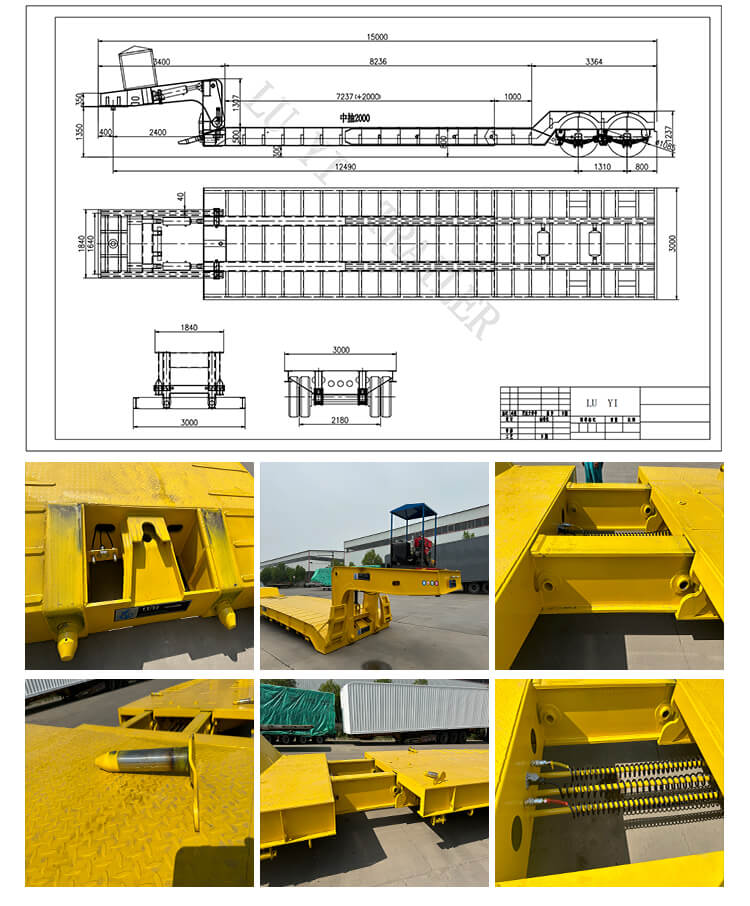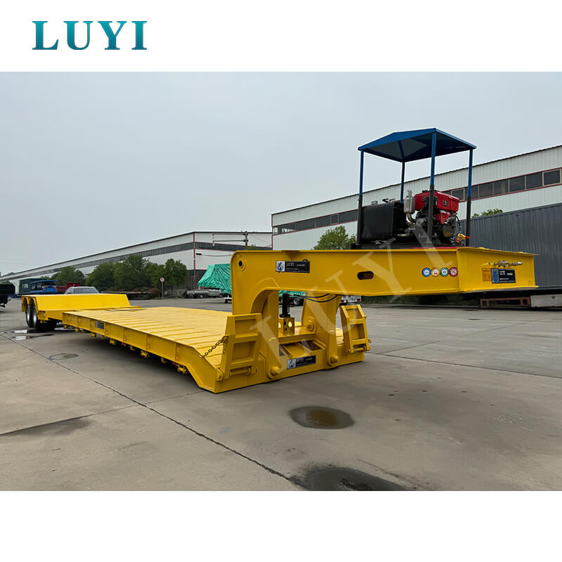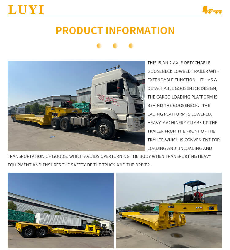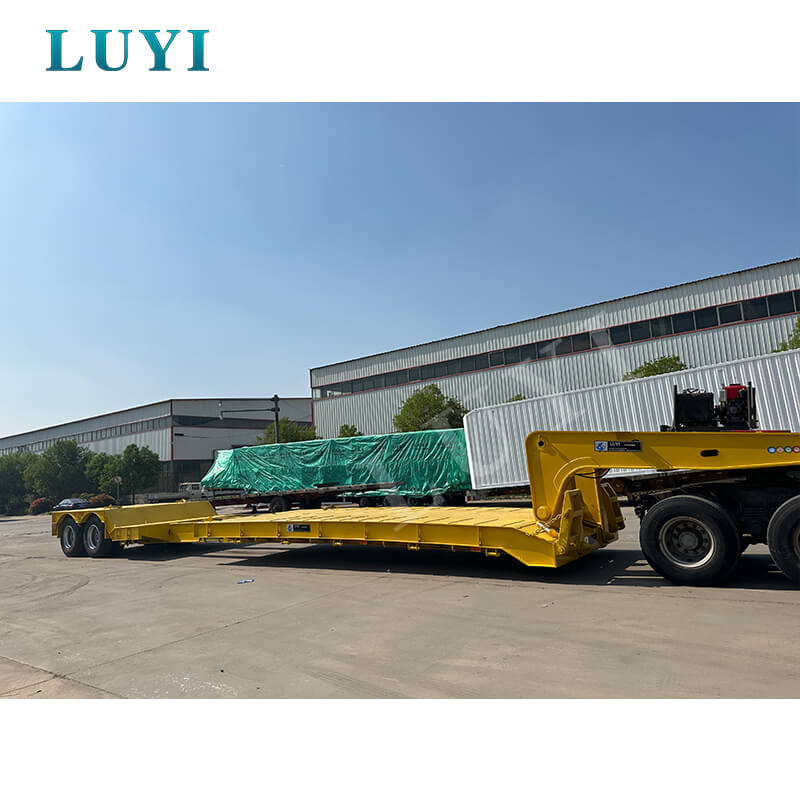 De Luyi Afneembare Gooseneck Lowboy Trailer, afkomstig uit Shandong, China, is een professionele oplegger voor zwaar transport. De hoofdbalk is vervaardigd uit hoogwaardig koolstofstaal en bestaat uit hoogwaardig Q345B/ST52-3-staal, wat een solide en duurzame structuur garandeert. Met een afmeting van 12000 mm × 2500 mm × 1650 mm is hij geschikt voor verschillende werkscenario's.