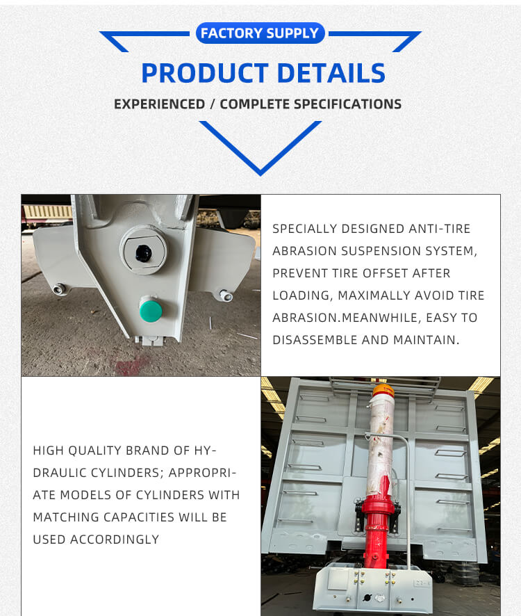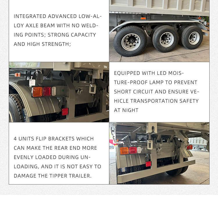 Het biedt flexibele configuraties om aan diverse behoeften te voldoen: asopties omvatten 2/3/4 assen van vertrouwde merken BPW en FUWA, en ophangingskeuzes van mechanische of luchtvering voor stabiel rijden. Uitgerust met 12R22.5-banden, een standaard landingsgestel van 28 ton en JOST-kingpins van 2"(50 mm)/3,5" (90 mm), zorgt hij voor een sterk aanpassingsvermogen. Het verfproces met polyurethaan verbetert de duurzaamheid, de kleur is aanpasbaar en wordt geleverd met een garantie van zes jaar, waardoor het betrouwbaar is voor langdurig zand- en grindtransport.