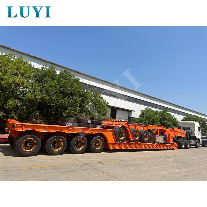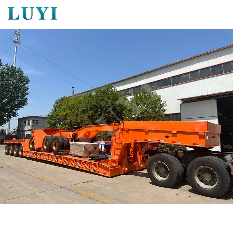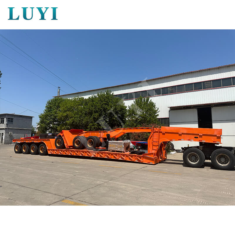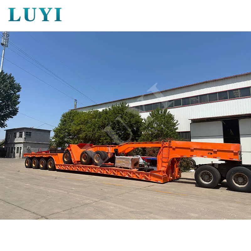 De 4-assige 100 ton zwanenhals Lowboy oplegger van LUYI VEHICLE is een krachtige vrachtwagenaanhangwagen afkomstig uit de provincie Shandong, China. De hoofdbalk is gemaakt van hoogwaardig staal en is gemaakt van T700/Q345-staal, wat een robuuste en duurzame structuur garandeert. Met een draagvermogen van 100-120 ton en een maximaal effectief laadvermogen van 120.000 kg voldoet hij gemakkelijk aan de zware transportbehoeften.