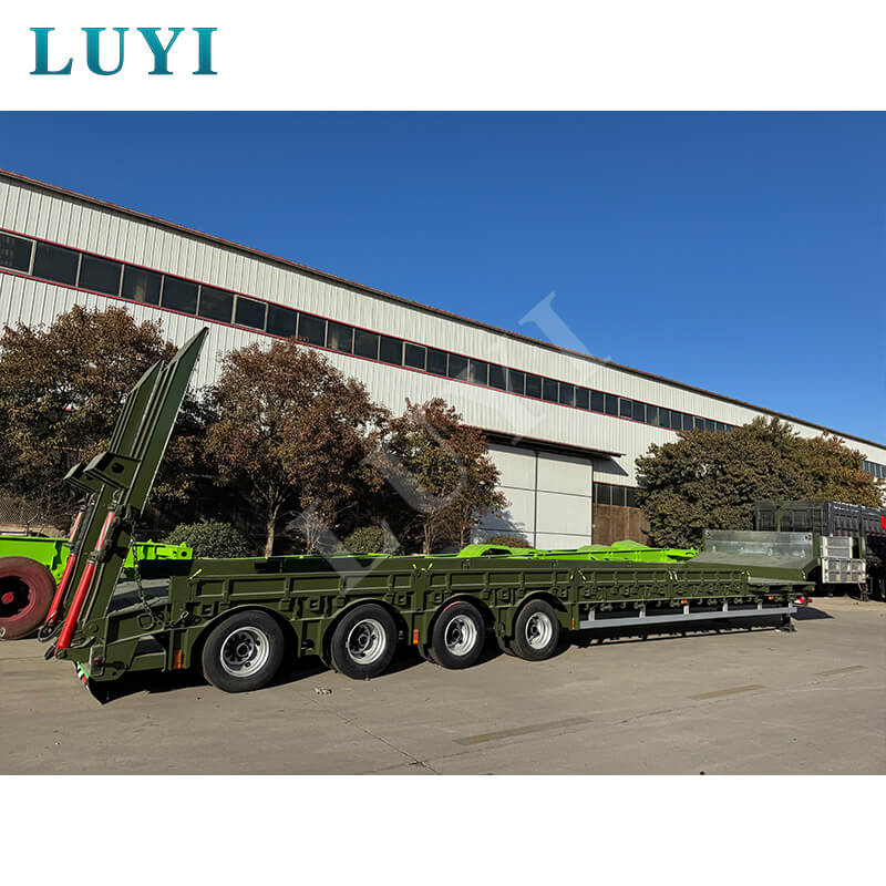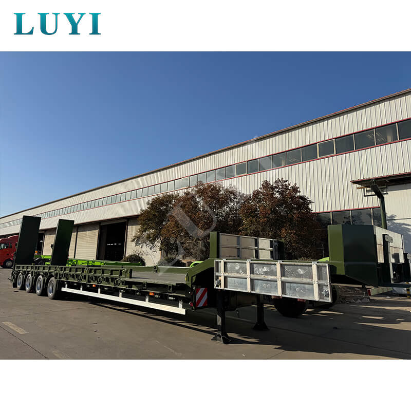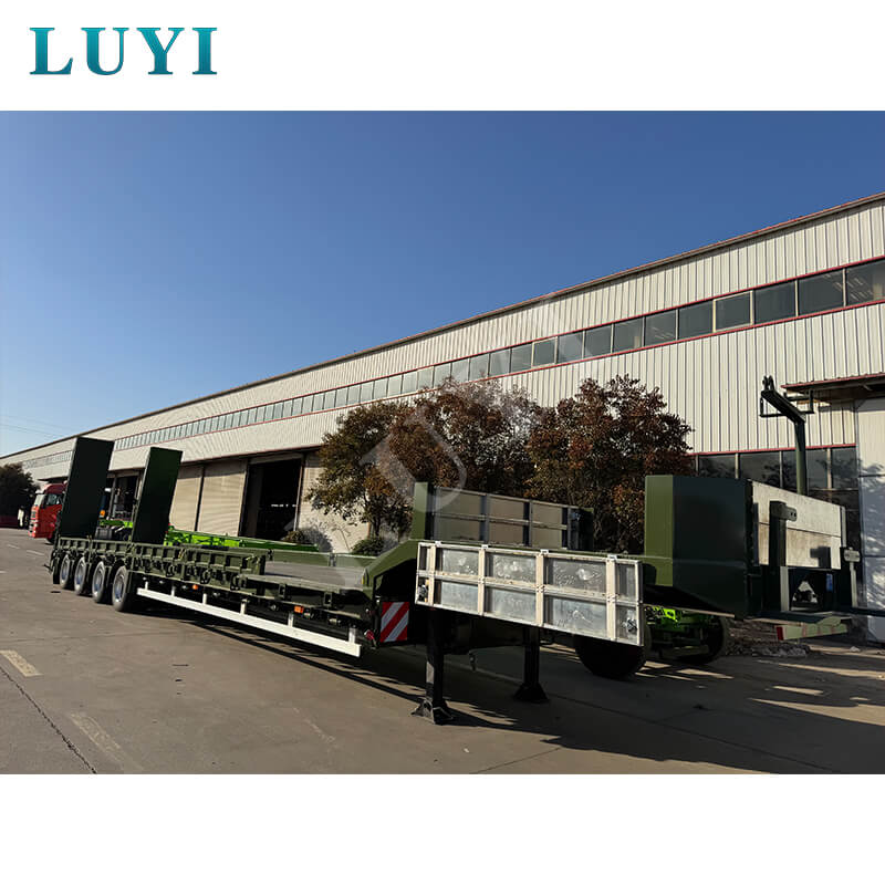 LUYI 4-assige 60-tons zwanenhals dieplader, een gloednieuw product uit Shandong, China, is een professionele vrachtwagenaanhangwagen ontworpen voor zwaar vrachtvervoer. Het gebruikt hoogwaardig staal als het belangrijkste materiaal, met een standaardgrootte van 13 x 3 x 2,5 meter en een maximaal laadvermogen van 60 ton om te voldoen aan de zware transportbehoeften.