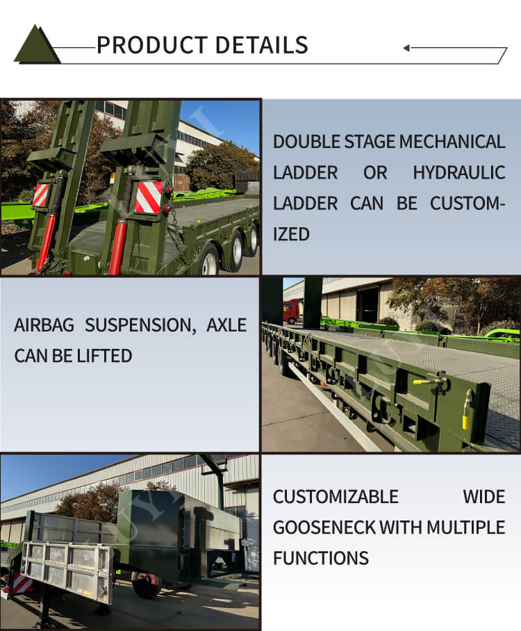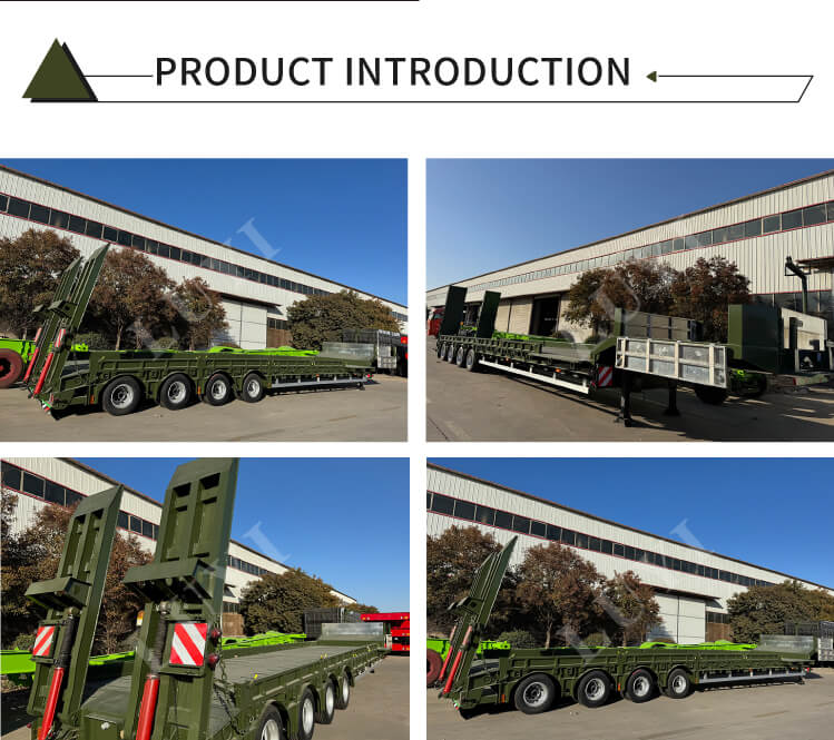 Uitgerust met 4 FUWA 13 ton assen en mechanische vering, gecombineerd met 12R22.5 banden, zorgt de trailer voor een stabiele werking en een sterk draagvermogen. Het heeft een standaard landingsgestel van 28 ton en optionele 90#/50# king pins voor een betrouwbare verbinding met tractoren. De kleur kan worden aangepast aan de behoeften van de klant, waarbij functionaliteit en personalisatie worden gecombineerd. Of het nu gaat om het vervoeren van grote machines of zwaar materieel, deze trailer is een betrouwbare keuze met uitstekende prestaties en solide kwaliteit.