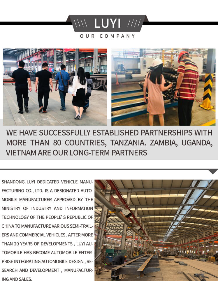 luyi semi trailer Manufacturing Co., LTD is gespecialiseerd in de productie van allerlei soorten opleggers cementtankwagens olietankwagens dumpopleggers containeropleggers flatpanel opleggers skeleton opleggers schuren opleggers low panel