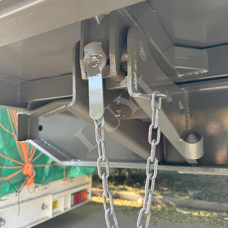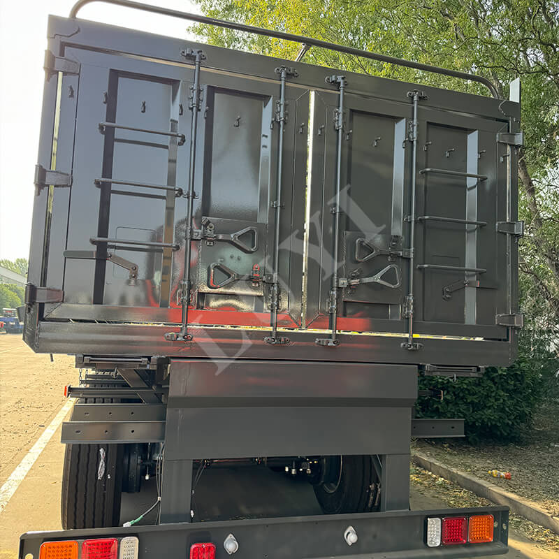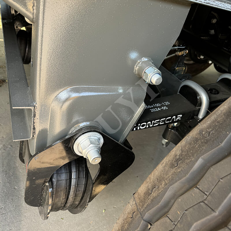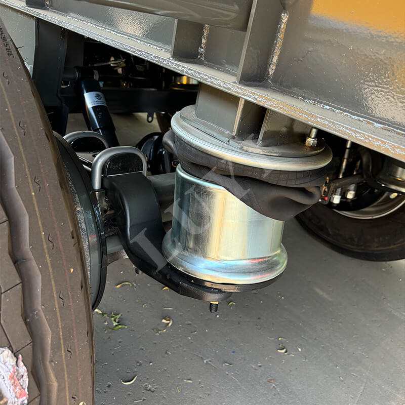 Het voertuig is uitgerust met 12R22.5 tubeless banden, die meerdere internationale certificeringen hebben doorstaan, waaronder ECE, GCC, ISO en DOT. Deze banden zijn slijtvast, duurzaam en verminderen het risico op klapbanden. Het biedt flexibele configuraties van 2/3/4 assen, gecombineerd met JOST-kingpins van 2 inch (50 mm) of 3,5 inch (90 mm), die zich aanpassen aan verschillende tractoren en voldoen aan verschillende transportscenario's. Het mechanische veersysteem zorgt voor stabiel rijden, en het volledige airbag-rollover-ontwerp verbetert de losefficiëntie aanzienlijk en verlaagt de arbeidskosten.