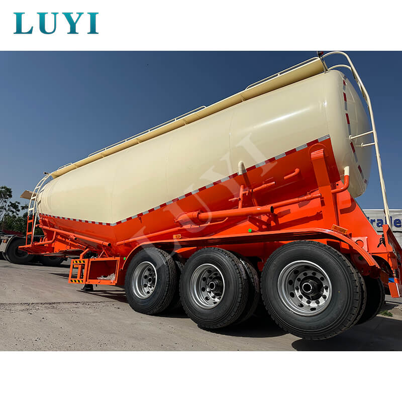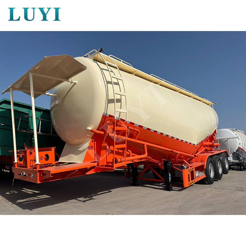 De 3-assige 40 kubieke meter V-type bulkcementtankoplegger van LUYI, provincie Shandong, China, is gemaakt van hoogwaardig staal en verkeert in gloednieuwe staat. Het is speciaal ontworpen voor het transport van cementpoeder in bulk, met een maximale effectieve belasting van meer dan 30.000 kilogram, en beschikt over een sterk draagvermogen.