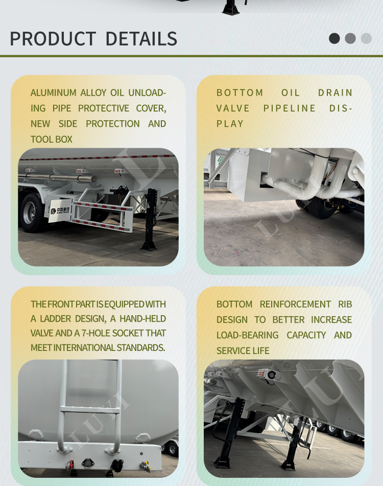 Speciale opleggers voor brandstoftransport van het merk LUYI zijn volledig uitgerust met lichtgewicht en corrosiebestendige brandstoftanks van aluminiumlegering en moeten worden gebruikt in combinatie met een trekker. De modellen bestrijken een breed capaciteitsbereik van 24.000 tot 50.000 liter en omvatten standaardversies met 3 assen en multiproductversies met 3 compartimenten, met een maximaal laadvermogen van 32.000 kg. Modellen met kleine capaciteit zijn geschikt voor de levering van kleine stations over korte afstanden, terwijl modellen met grote capaciteit met meerdere compartimenten het transport van meerdere producten over lange afstanden ondersteunen en volledig voldoen aan de uiteenlopende behoeften op het gebied van brandstofdistributie van benzinestations, raffinaderijen en meer.