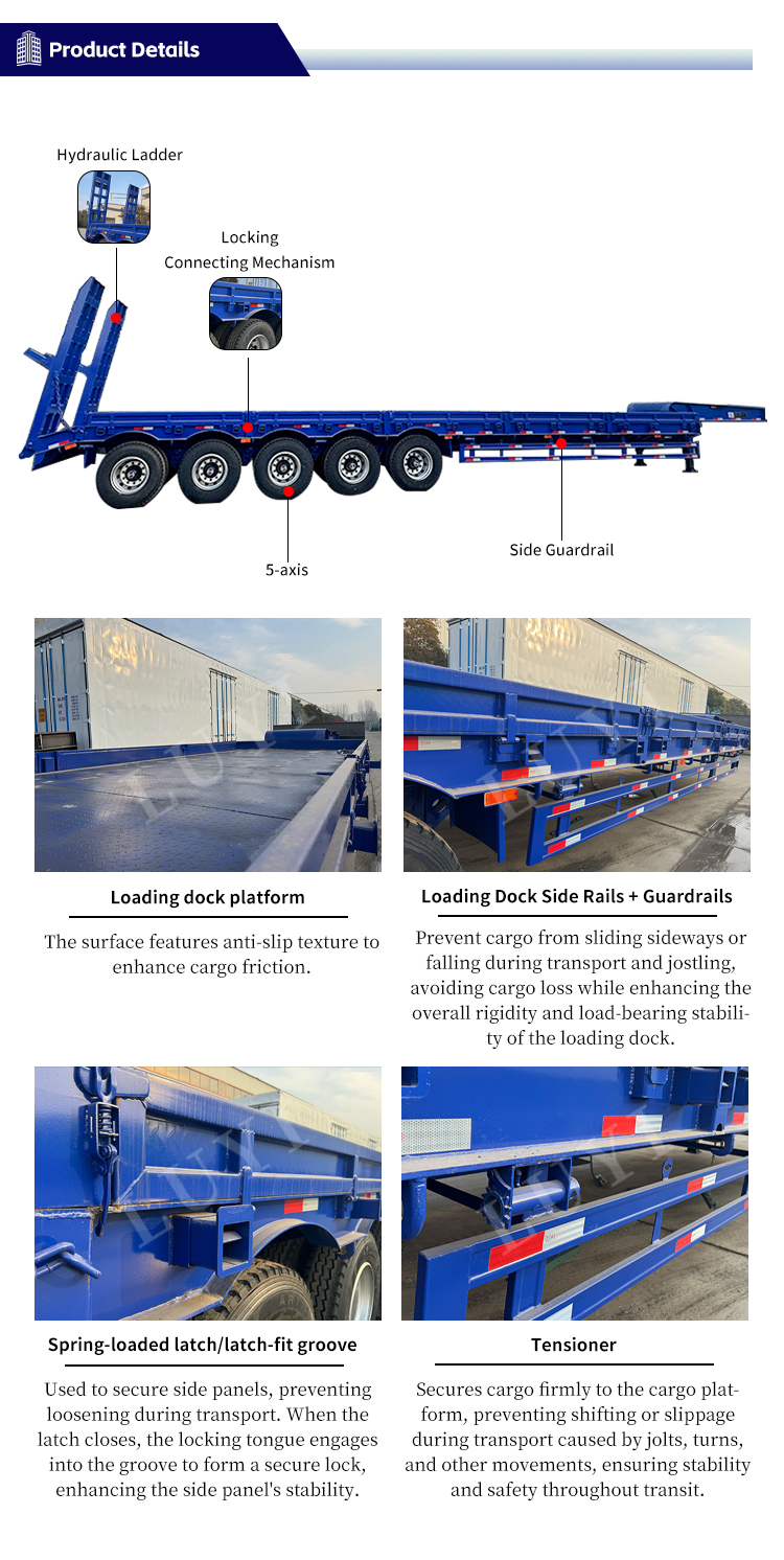 Uitgerust met hoogwaardige componenten, beschikt hij over Fuwa/BPW-assen van 13 ton in combinatie met een luchtveringssysteem, wat zorgt voor uitzonderlijke rijstabiliteit en schokabsorptie. Het Jost 28-tons landingsgestel met twee snelheden maakt efficiënt heffen en dalen mogelijk. Klanten kunnen kiezen uit bandenopties, waaronder 315/80R22.5, 12R22.5 en 11.00R20, passend bij uiteenlopende wegomstandigheden. Het 24V LED-verlichtingssysteem levert heldere verlichting met een laag energieverbruik, en de carrosseriekleur kan worden aangepast aan de individuele vereisten. Gesteund door de betrouwbare kwaliteit van Luyi, biedt deze oplegger een vertrouwde oplossing voor zwaar transport voor wereldwijde klanten.
