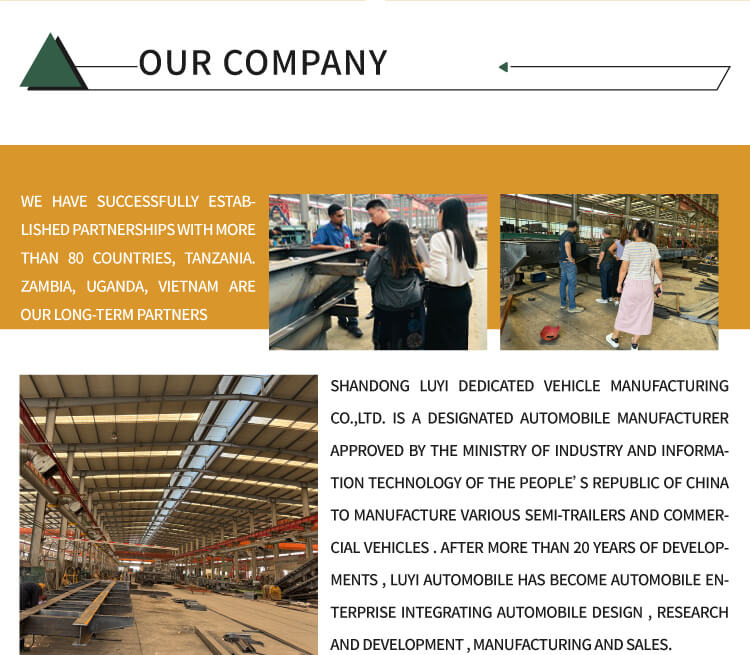 luyi semi trailer Manufacturing Co., LTD is gespecialiseerd in de productie van allerlei soorten opleggers cementtankwagens olietankwagens dumpopleggers containeropleggers flatpanel opleggers skeleton opleggers schuren opleggers low panel