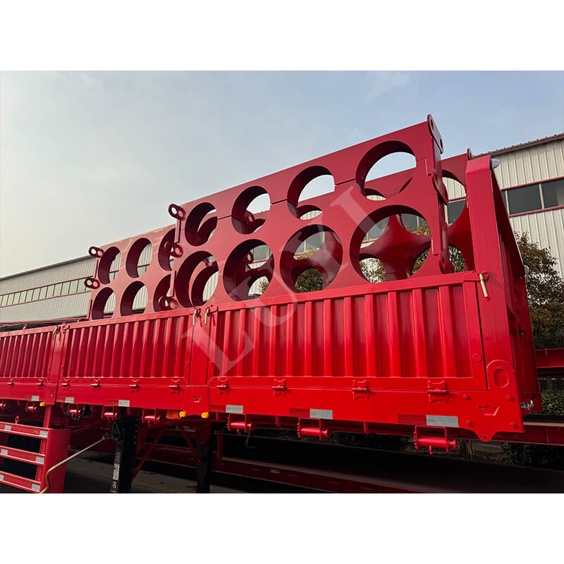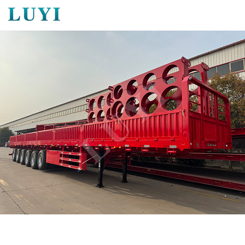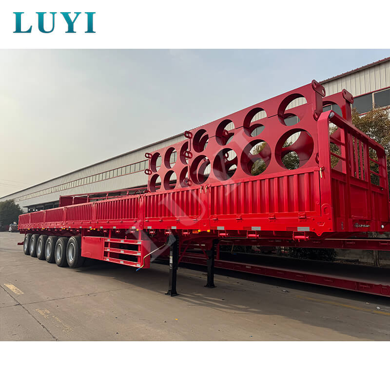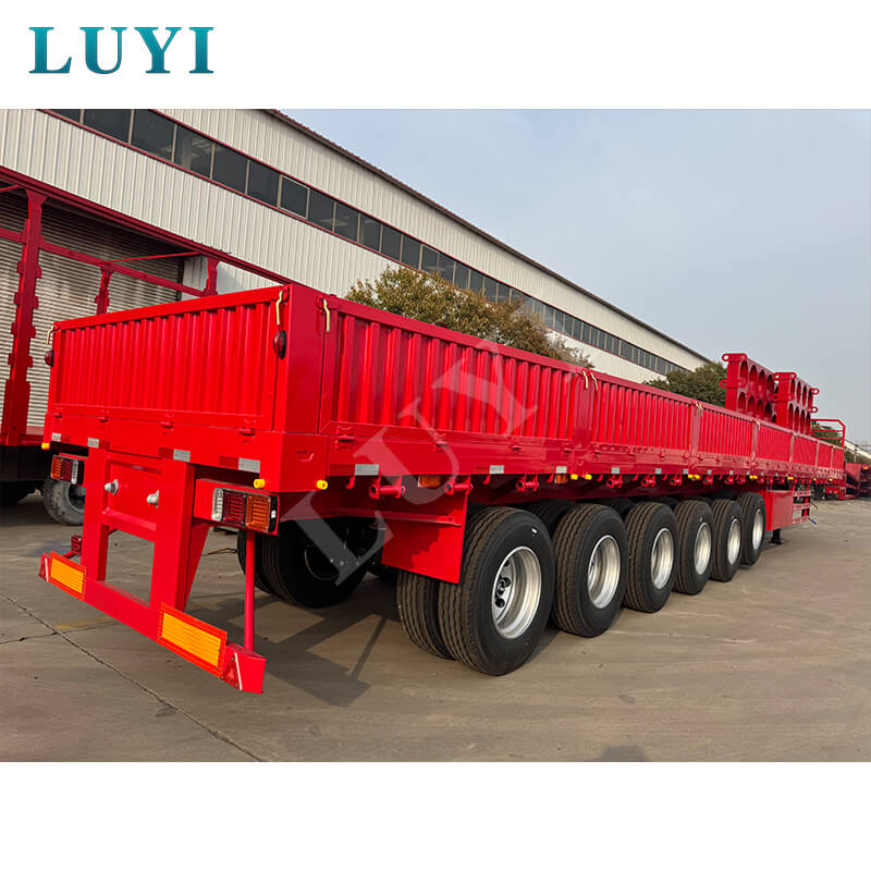LUYI 6-assige 15,5 m 80-100 ton 40ft zijwandoplegger, ook wel een paal-/dieplader genoemd, is afkomstig uit Shandong, China. Het is een hoogwaardige oplegger ontworpen voor het vervoer van containers en bulkgoederen. Hij is volledig gemaakt van staal, meet 15500 x 2500 x 1600 mm en heeft een maximaal effectief laadvermogen van 60-100 ton, en beschikt over een sterk draagvermogen om gemakkelijk te voldoen aan de behoeften op het gebied van zwaar vrachtvervoer.