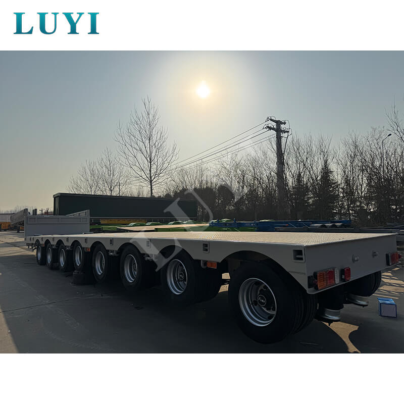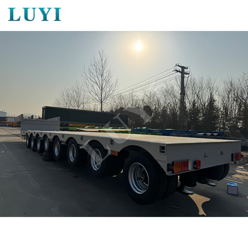 De trailer is uitgerust met 8 Fuwa- of BPW-assen en ondersteunt mechanische of luchtveringopties voor een stabiele werking. Hij komt overeen met 12R22.5/12.00R20/11R22.5-banden en is uitgerust met een standaard landingsgestel van 28 ton en JOST-kingpins van 2 inch (50 mm) of 3,5 inch (90 mm) voor een veilige verbinding. Met aanpasbare kleuren en solide structuur combineert het flexibiliteit, duurzaamheid en veiligheid, waardoor het een ideale keuze is voor zwaar transport van apparatuur.