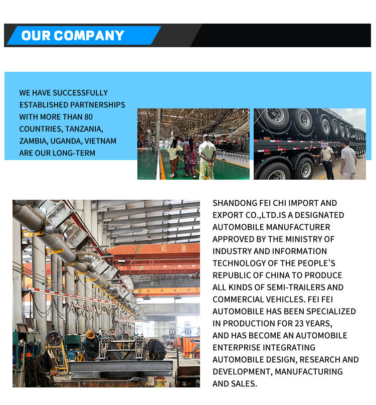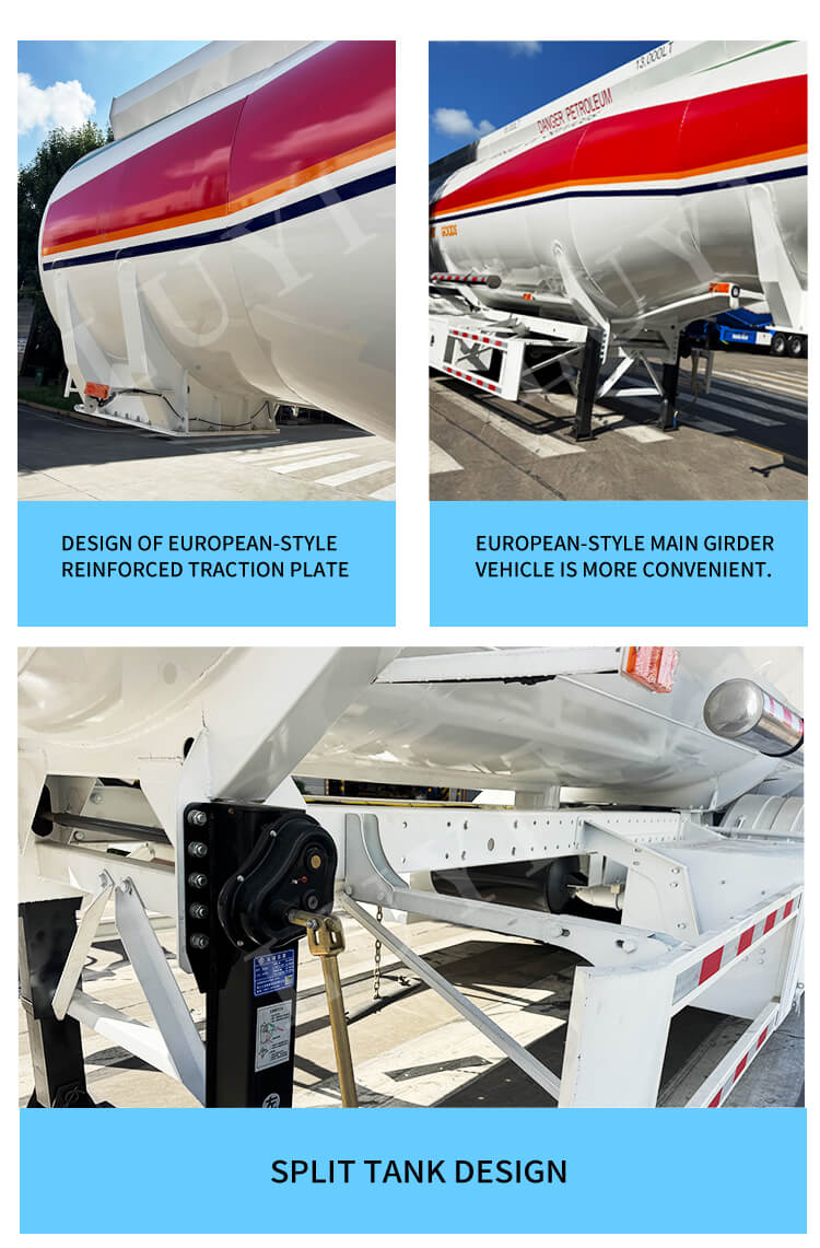 De trailer beschikt over solide en betrouwbare configuraties. Hij is uitgerust met 13/16 ton assen van merken als Fuwa, BPW of BERKLEY en biedt optioneel mechanische of luchtvering. Het is compatibel met verschillende bandenspecificaties, waaronder 11.00r20, 12r22.5 en 315/385, waardoor stabiel rijgedrag en aanpassingsvermogen aan verschillende wegomstandigheden worden gegarandeerd. Het wordt geleverd met een standaard landingsgestel van 28 ton en 50#/90# kingpins voor gemakkelijke en veilige bediening. Het product ondersteunt op maat gemaakte carrosseriekleuren, waarbij functionaliteit en personalisatie worden gecombineerd om een stabiele en efficiënte professionele oplossing voor olietransport te bieden.