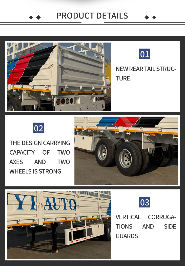 LUYI's nieuw ontworpen 2-assige zijwandoplegger met hoge hekwerk biedt dubbele laadcapaciteiten van 30 en 60 ton, perfect geschikt voor middelzware en zware vrachtbehoeften zoals bouwmaterialen, industriële apparatuur en landbouwproducten. De hoge hekstructuur voorkomt effectief dat er lading wordt gemorst tijdens het transport, terwijl u met de aanpasbare functies de hoogte van het hek, de materialen van de wagen en de antislipvloeren kunt aanpassen aan uw exacte wensen. Deze veelzijdige, op maat gemaakte trailer is nu te koop, ideaal voor zowel logistieke bedrijven als vrachtvervoerders.