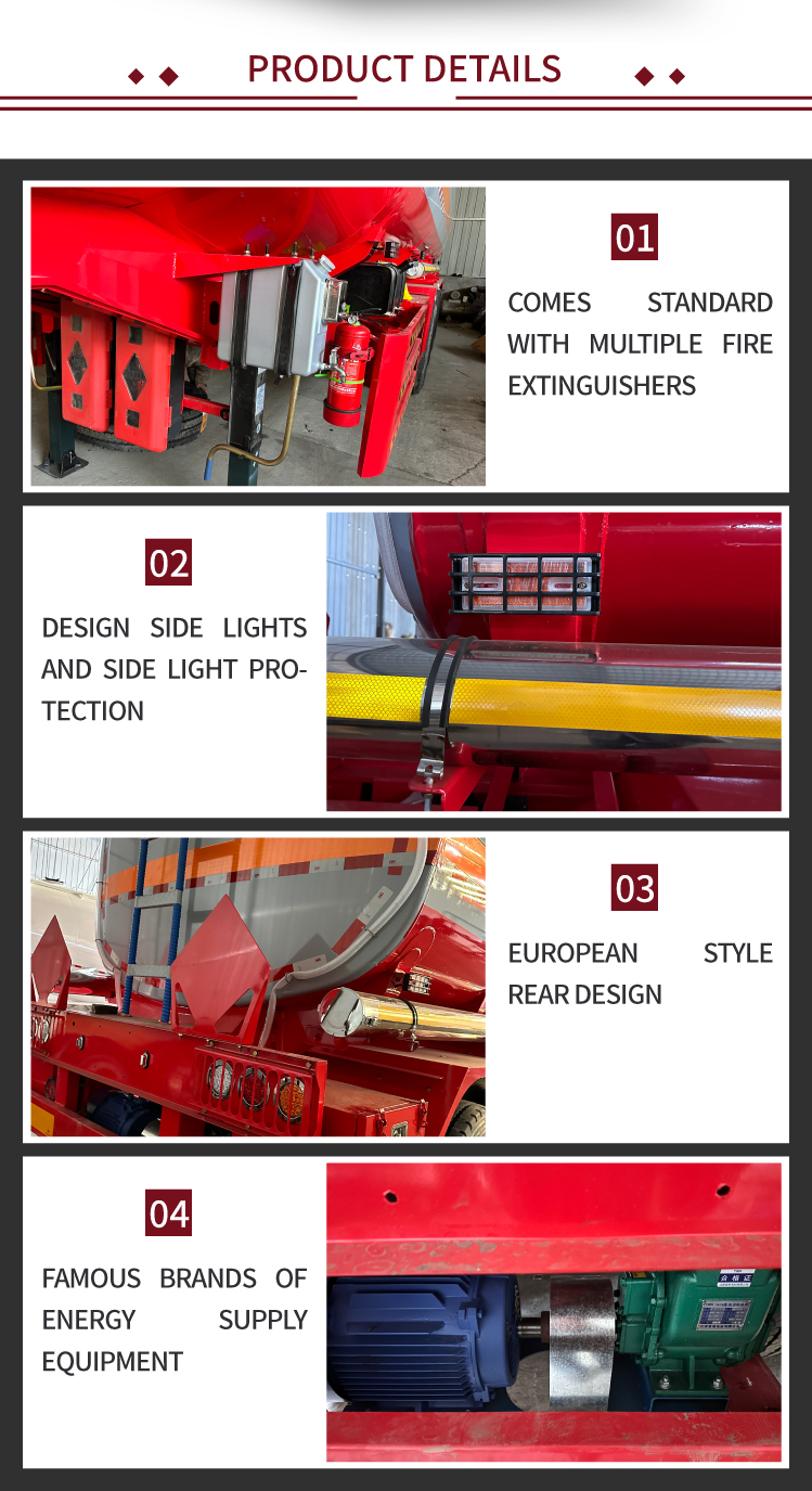 Het biedt uitgebreide maatwerkmogelijkheden en ondersteunt structurele aanpassingen (ontwerp met meerdere compartimenten, verstelbare olie-inlaten/-uitlaten), materiaalupgrades (Q235 koolstofstaal, roestvrij staal voor corrosiebestendigheid, aluminiumlegering voor lichtgewicht) en functionele toevoegingen (golfschotten, temperatuurregeling, intelligente niveaumeters). Als oplegger kan hij worden gecombineerd met trekkers voor hoge flexibiliteit (apart parkeren voor onderhoud) en strikte naleving van nationale regelgeving, inclusief drukcontrole.e-tests en lekpreventie, waardoor veilig en efficiënt olietransport wordt gegarandeerd.
