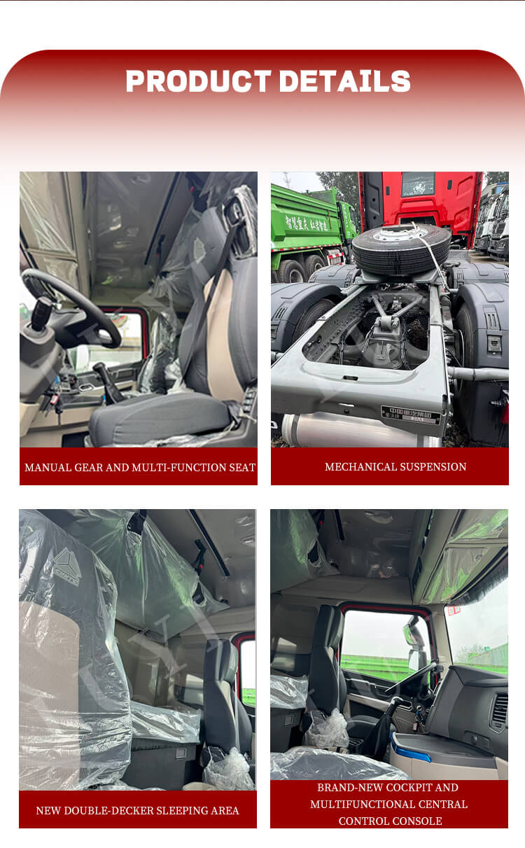 De truck is uitgerust met een 6X4-aandrijfsysteem en is gekoppeld aan een handgeschakelde ZF-versnellingsbak met 12 versnellingen vooruit en 2 versnellingen achteruit, waardoor een nauwkeurige en betrouwbare bediening wordt gegarandeerd. Met afmetingen van 717024963980 mm, een bruto voertuiggewicht van 5001-10.000 kg en een laadvermogen van meer dan 50 ton, is hij uitgerust met 10 banden (11.00R20 of 12.00R20) voor uitstekende draagprestaties.