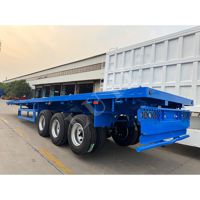 Deze drieassige platte oplegger met een lading van 60 ton is zorgvuldig ontworpen voor zware transportscenario's. Er wordt gebruik gemaakt van hoogwaardig constructiestaal om ervoor te zorgen dat de carrosserie uitstekende sterkte en duurzaamheid heeft, en is niet bang voor de zware tests onder complexe werkomstandigheden.