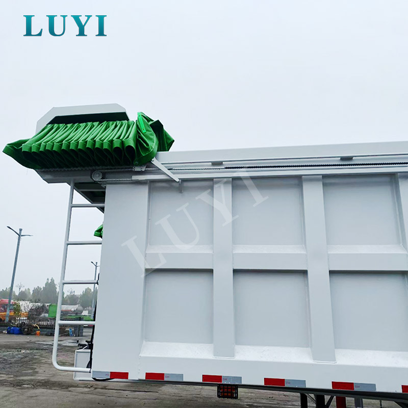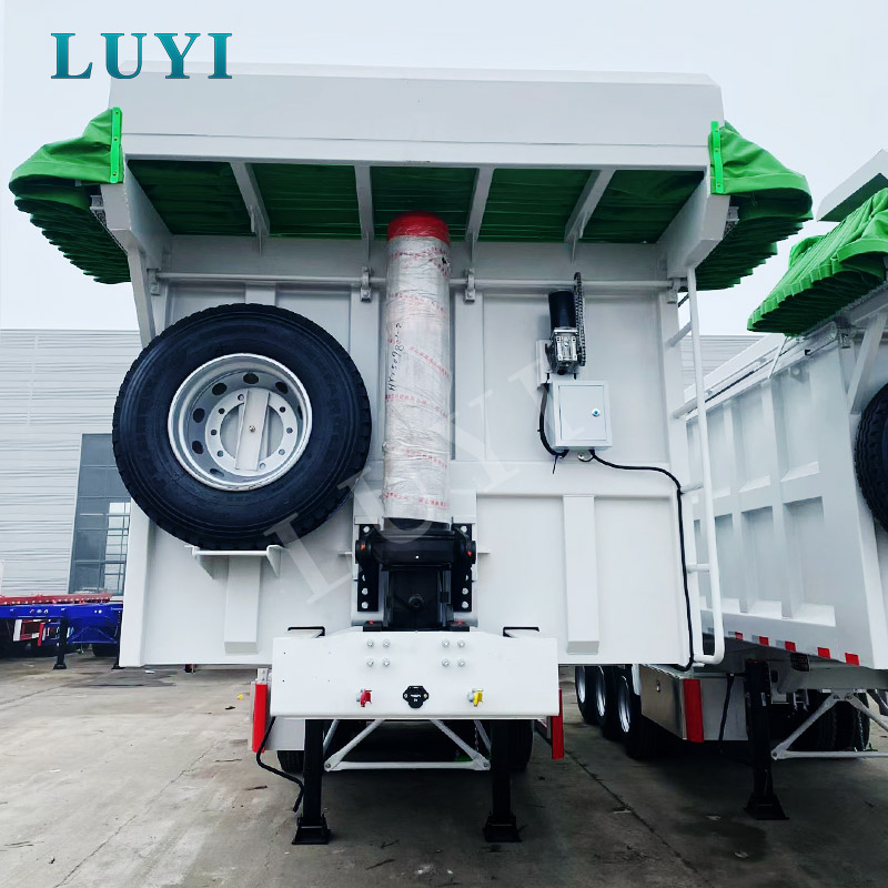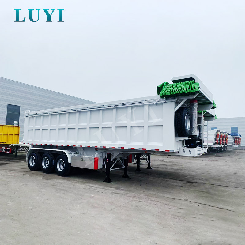 De witte 3-assige achterwaarts kantelbare dumpoplegger van het merk LUYI, afkomstig van hoogwaardige productie in Shandong, China, is een efficiënte vrachtwagenaanhangwagen die speciaal is ontworpen voor het transport van zware ladingen. Het product is gemaakt van hoogwaardig staal en heeft een stabiele en duurzame structuur. Het heeft afmetingen van 1300 mm x 2500 mm x 4000 mm en een maximaal laadvermogen van 100 ton, waardoor het gemakkelijk voldoet aan de transportbehoeften van verschillende zware goederen.